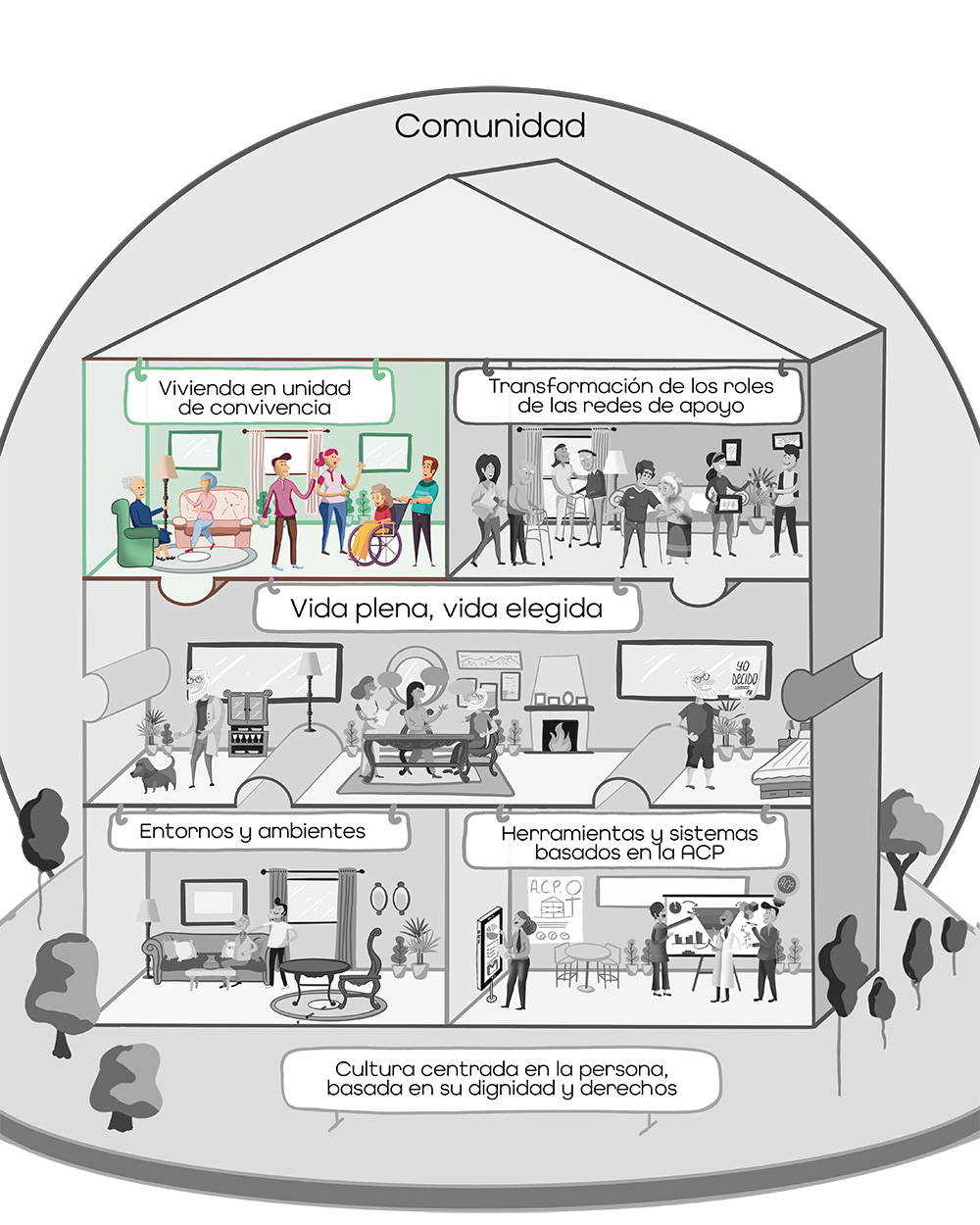 Esta dimensión del marco se centra en las claves organizativas de la unidad de convivencia, sin olvidar que ésta también se define desde el punto de vista del ambiente físico, los espacios y su uso, así como la combinación de espacios privados y espacios compartidos, pensados para la convivencia, como factor clave para una vida digna en unidad de convivencia. Estos aspectos se abordan de manera más detallada en la dimensión “Entornos y ambientes”.